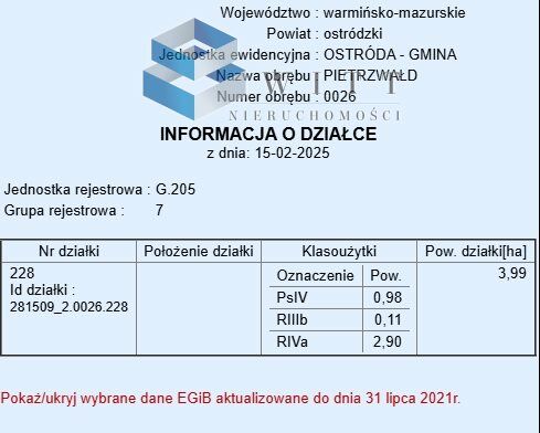 działka nr 228 - pow. 3,99 ha, dojazd drogą utwardzoną.